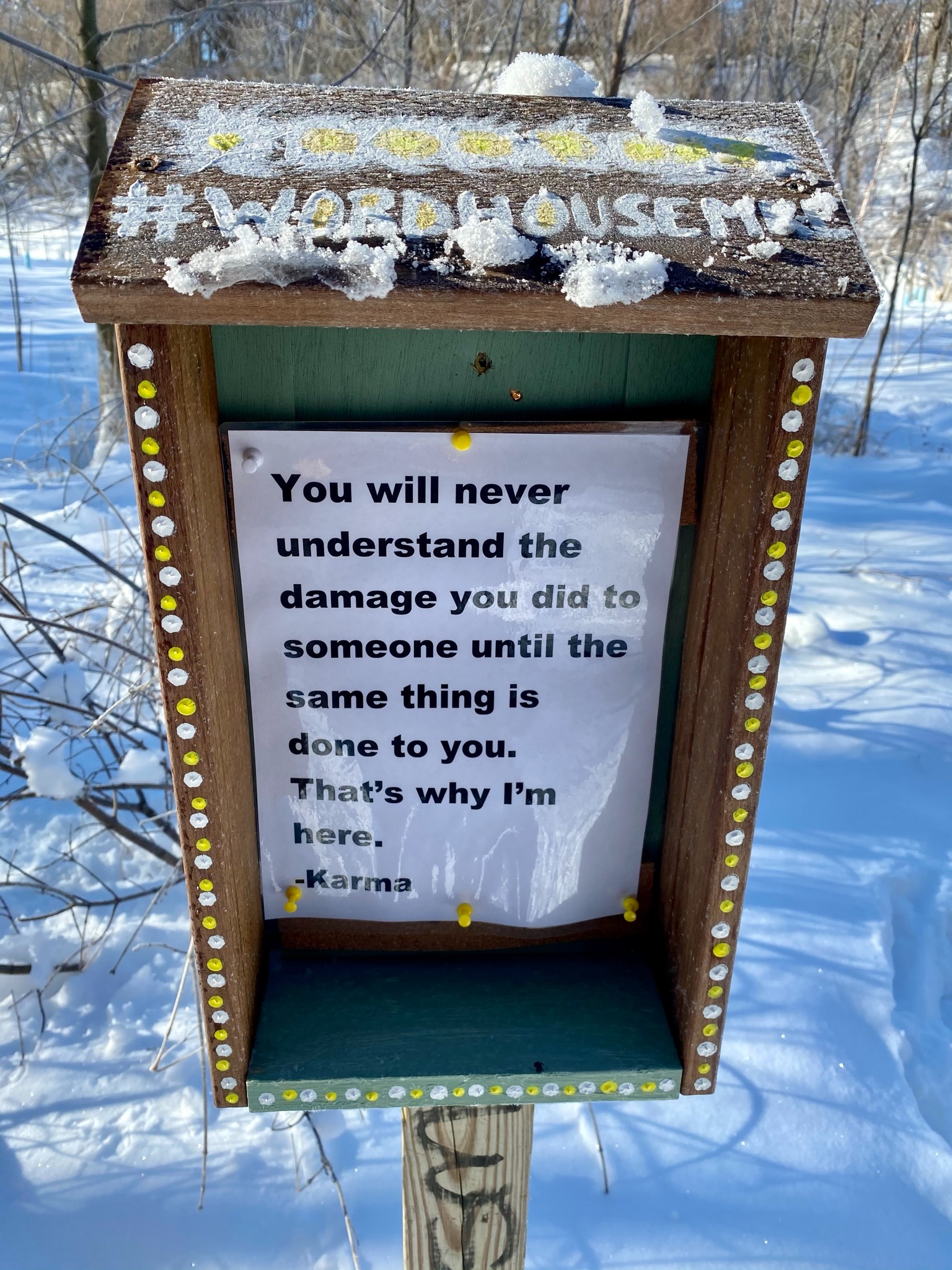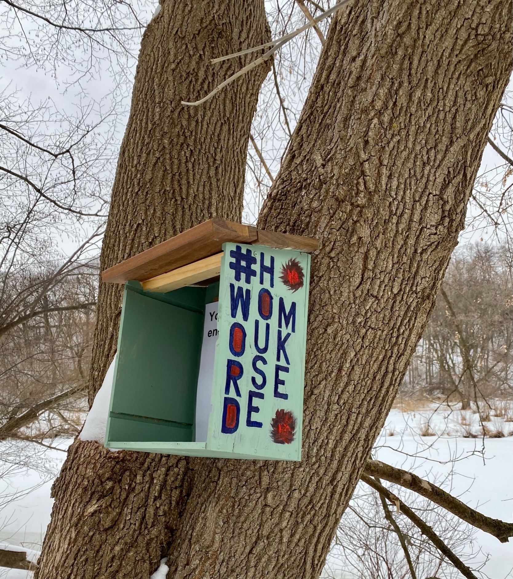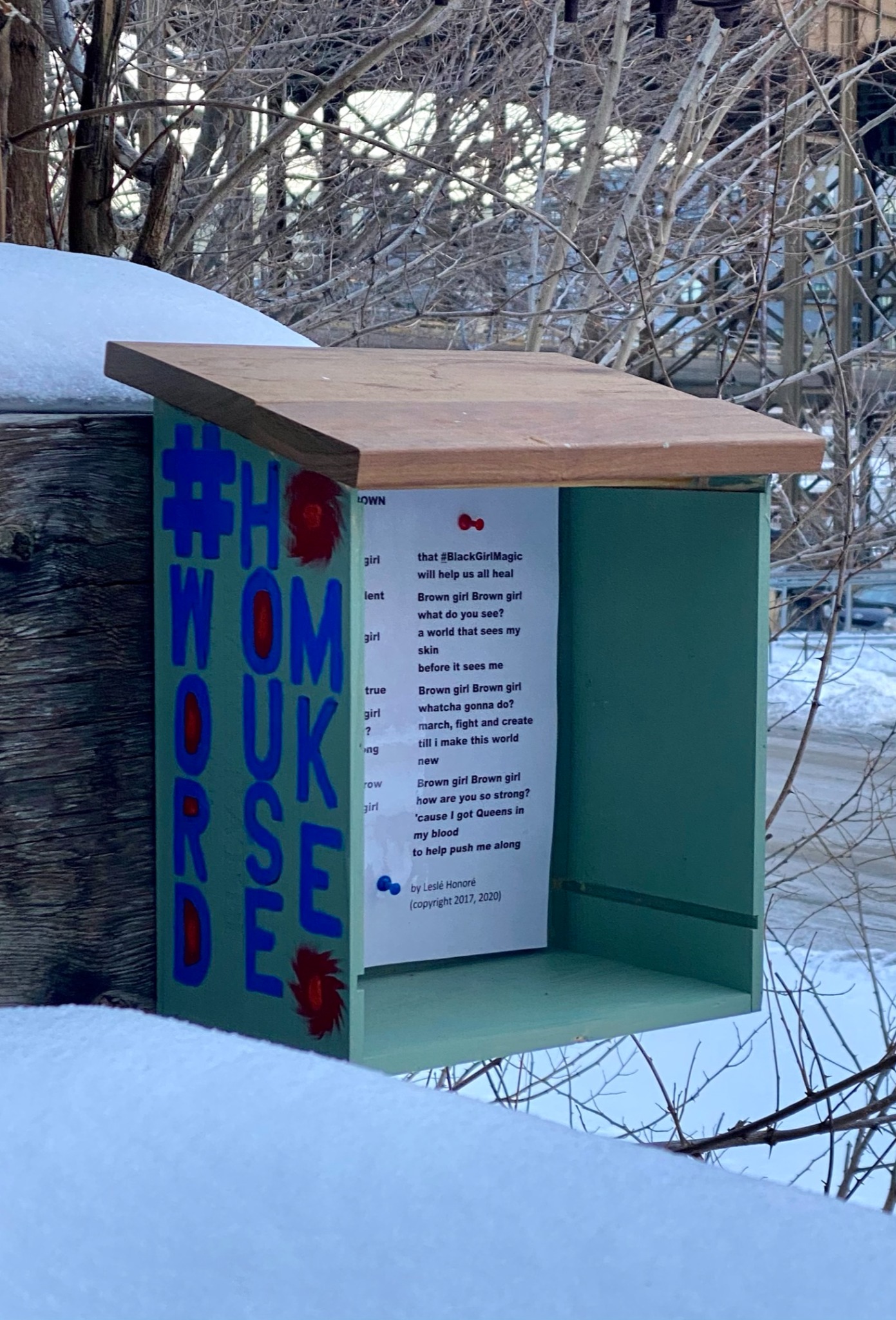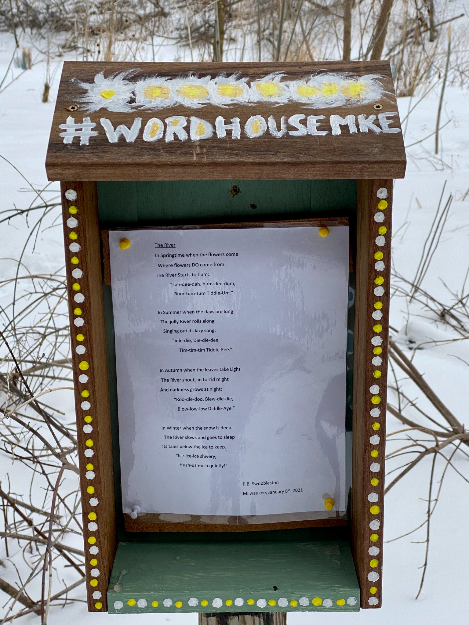 It started in September 2020 with a visit to Idaho City, Idaho, were I saw two painted boxes with poems in them. From there I created #WordHouesMKE with the first WordHouse made from scrap wood and dismantled cabinets from my home and installed at Turtle Park in Milwaukee in October 2020.